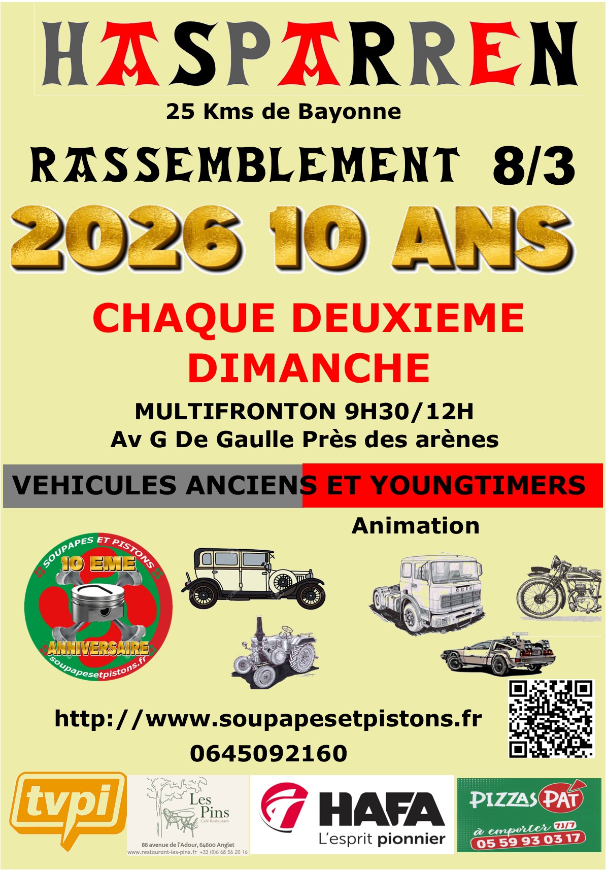 Recherchez vous un club d'amateurs et collectionneurs de véhicules anciens et historiques ? Depuis maintenant plus dix ans sur le Pays Basque et le sud-ouest France, le club Soupapes et pistons s'adresse aux amateurs et collectionneurs de voitures anciennes, yountimers et de tous véhicules anciens ainsi que pour la préservation et usage du patrimoine automobile international , Vous cherchez aussi un rassemblement de voitures anciennes pour votre week-end dans le Sud-ouest en Pyrénées-Atlantiques Pays Basque ? Ne cherchez plus ! Ici plus qu'une association ou club de voitures anciennes, nous ne collectionnons pas vraiment! Nous protégeons et faisons apprécier le patrimoine automobile en le faisant circuler. Venez nous retrouver pour y participer vous même. Le club "Soupapes et Pistons" organise des rassemblements régulièrement à Bayonne et Hasparren, des événements CARITATIFS et des balades en voitures de collection en participant à des événements d'autres clubs de véhicules anciens à travers le Pays Basque, Landes et l'Espagne. En résumé; le club Soupapes et pistons est un club du Pays Basque couvrant le secteur du Sud-ouest France sur plusieurs départements ainsi que plusieurs provinces et villes importantes d'Espagne pour les vehicules anciens (auto / moto / utilitaire / agricole)